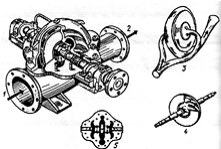 патрубок; 3-схема жидкости в насосе; 4 -вал насоса и рабочее колесо; 5-крышка