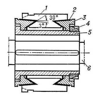 манжета; 3 - конусная нажимная шайба; 4- кольцевая гайка; 5 - втулка; 6 - вал