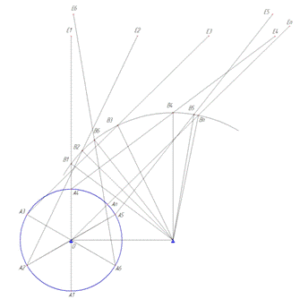 звеника В1,В2, В3, В4, В5, В6 радиусом, равным (OА + AB), проводим окружности;
