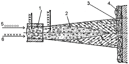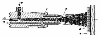 прижатия пламени к распыляемому материалу расширяющимся воздушным конусом.