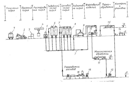 термообработки); 14 - стол упаковки; 15 - дробилка; 16 - гранулятор для