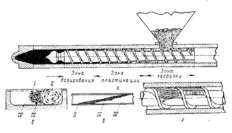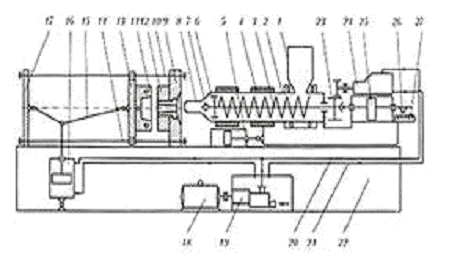 выступающего в качестве поршня шнека впрыскивается в формующую полость литьевой