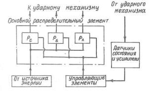 поршня-ударника, - напорная магистраль соединена с камерами А, Б, В; сливная -