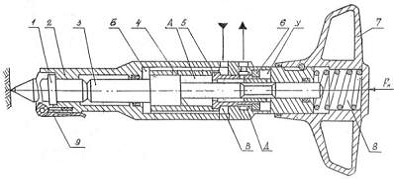 устройство; 6 - винтовой стержень (винт); 7 - поршень-ударник; 8 - направляющая