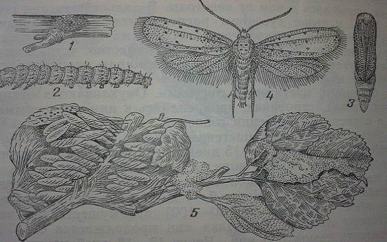 гусеница, 3- куколка, 4- бабочка, 5- поврежденные листья с коконами)