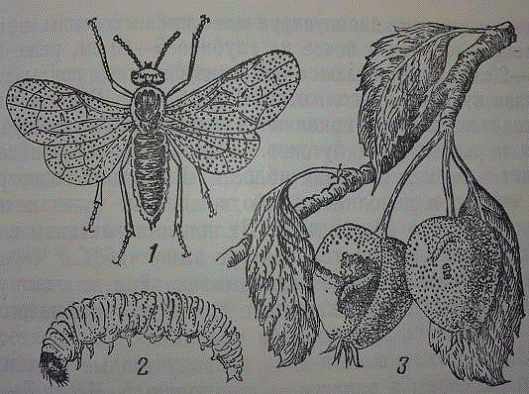 пилильщик, 2- ложногусеница, 3- поврежденные плоды яблони).