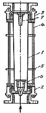 при нулевом расходе жидкости или газа. Верхний патрубок 3 снабжен ограничителем