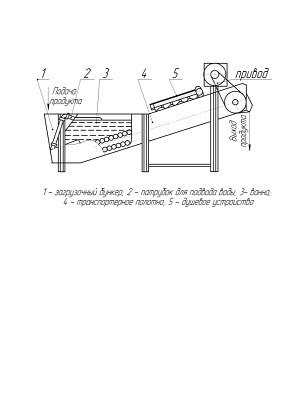 попадают в ванну 3, заполняемую моющим раствором из патрубка 2. По транспортеру