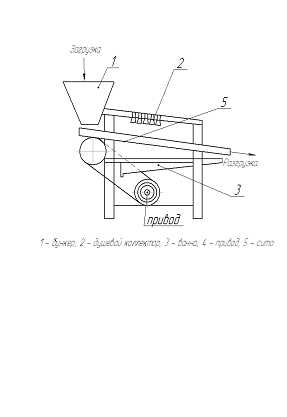 загружаемые в бункер 1, попадают на сита 5, совершающие