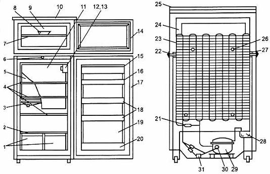 воды; 29 - герметичный компрессор; 30 - клеммная колодка; 31 - пускозащитное