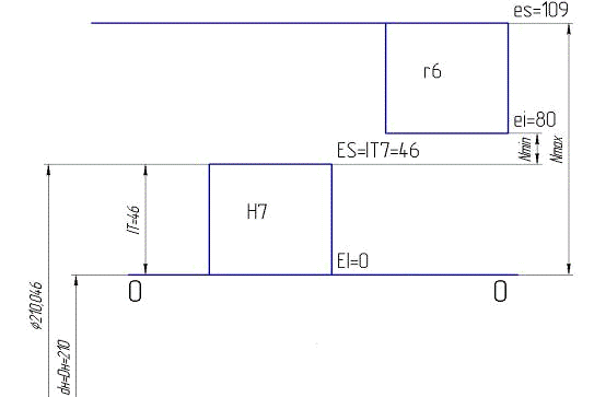 Изобразим схему полей допусков для посадки H7/r6 на рис. 1: