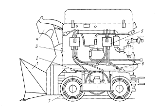 трансмиссия, гидропривод погрузочного органа и механизма поворота машины,