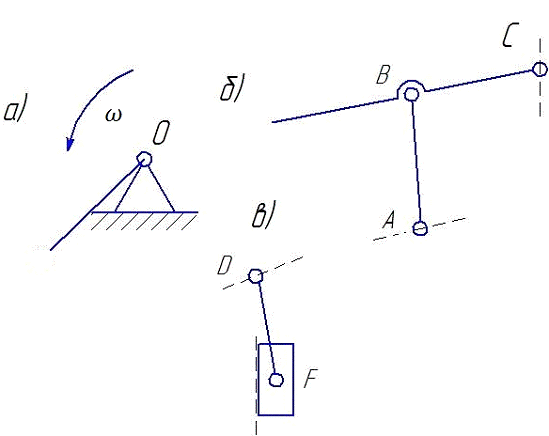 Данный механизм содержит семь кинематических пар: O, A, B, C, D, F0, F. Из них O, A, B, C, D, F - вращательные кинематические пары со степенью свободы