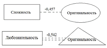 (r=0,549), и оригинальностью (r=0,429), а также отрицательную взаимосвязь с