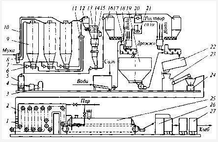 операций через увлажнительный аппарат 16 и винтовой конвейер 17.