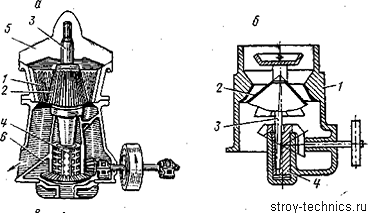 цилиндрические и конические; по способу выхода измельченного материала - со