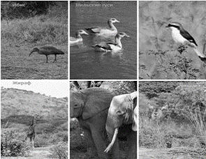 право: ибис, нильские гуси, сероплечий сорокопут, жираф, африканский слон,