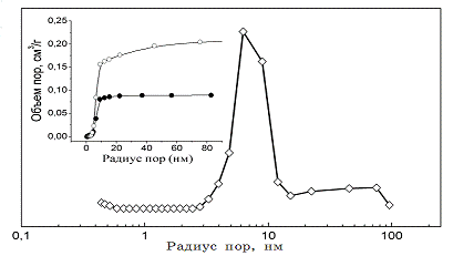 рассчитанное из данных капиллярной адсорбции азота. На вставке приведены
