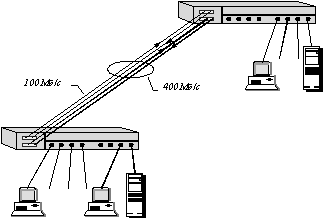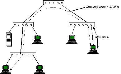 четырех хабов). Для витой пары это дает увеличение до 500 м (рисунок 2.2).