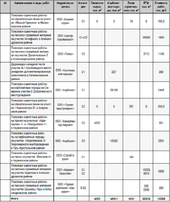 песчано-гравийных материалов - 33740 тыс. м³, расположенных в Александровском, Юрьев-Польском, Селивановском