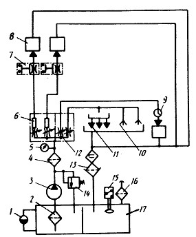 3-насос; 4-фильтр напорной магистрали; 5-манометр; 6-смазочный дроссельный