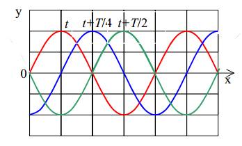 x: чем дальше от источника расположена точка шнура, тем сильнее «запаздывают»