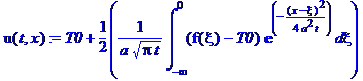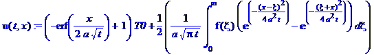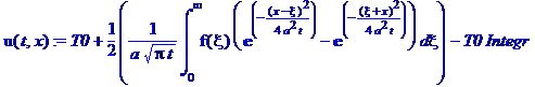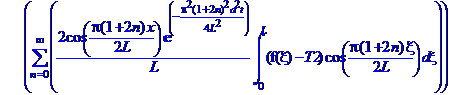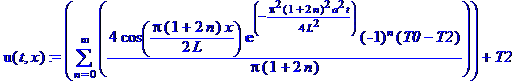 u(t,x):=sum(2/L*cos(1/2*Pi*(1+2*n)/L*x)*exp(-1/4*Pi^2*(1+2*n)^ 2/L^2*a^2*t)*int((T0-T2)*cos(1/2*Pi*(1+2*n)/L*xi),xi