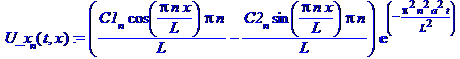 > lambda[n]:=Pi*n/L;[n](t,x):=(C1[n]*sin(lambda[n]*x)+C2[n]*cos(lambda[n]*x))*exp(-lambda[n]^2*a^2*t);_x[n](t,x):=diff(U[n](t,x),x);