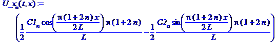 lambda[n]:=1/2*Pi*(1+2*n)/L;[n](t,x):=(C1[n]*sin(lambda[n]*x)+C2[n]*cos(lambda[n]*x))*exp(-lambda[n]^2*a^2*t);_x[n](t,x):=diff(U[n](t,x),x);