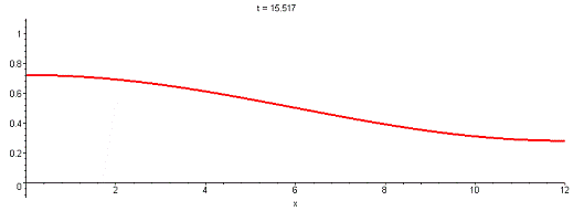 > animate(plot,[u(t,x),x=0..12, y=-0.1..1.1], t=0.0001..30,