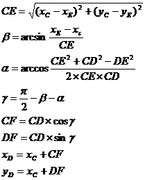 d:pnt);CE,CF,DF:integer;,alpha,g:real;:=round(sqrt(sqr(c.x-e.x)+sqr(c.y-e.y)));:=arcsin((e.x-c.x)/CE);:=arccos((sqr(ce)+sqr(cd)-sqr(de))/(2*ce*cd));:=pi/2-beta-alpha;:=round(CD*cos(g));:=round(CD*sin(g));.x:=c.x+CF;.y:=c.y-DF;;TForm1.L7Change(Sender: