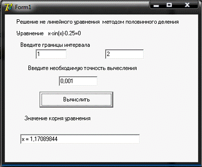 ;d>e do:=(a+b)/2;f(c)>0 then b:=c{выбор точки сближения}a:=c;:=(b-a)/2;;:=(b+a)/2;.text:='x =