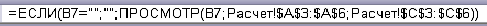 = ЕСЛИ(A4="";"";ПРОСМОТР(A4;Расчет!$A$3:$A$6;Расчет!$E$3:$E$6)).