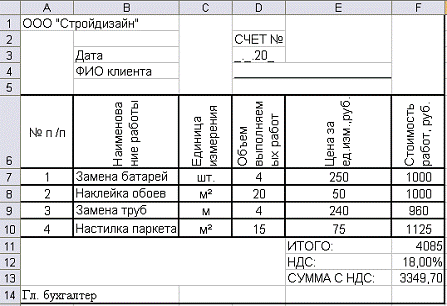 работ, таблицы «Форма счета на оплату выполненных услуг», находящейся на листе