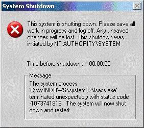 появление на экране сообщения о сбое в процессе lsass.exe, в результате чего
