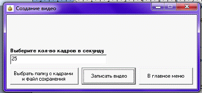 Кнопка «Создание видео» открывается форма, реализующая режим создания avi файла из кадров. С помощью кнопки