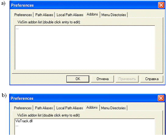 - открыть закладку Addons (рис. 1.6) и подсоединить файл динамической библиотеки VisTrack.dll, находящийся в папке Tanker (для этого следует сделать двойной щел- чок левой