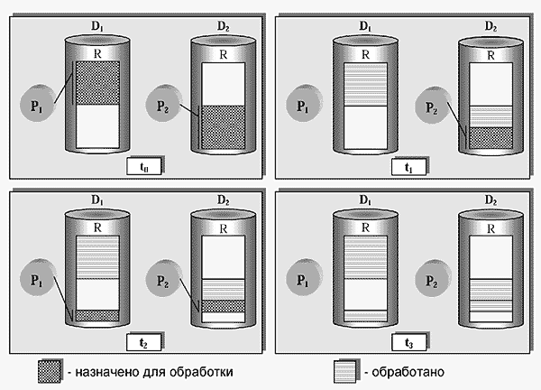 закончил обработку своей части отношения R, в то время как процессор P2 успел