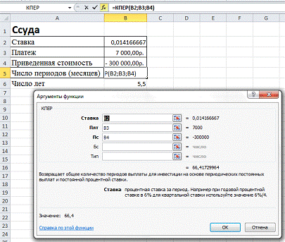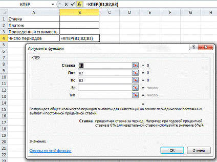 формула следующего вида: =КПЕР (B1; B2; B3). Окно "Аргументов