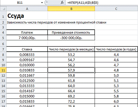 зависимость числа периодов от изменения процентной ставки, от изменения