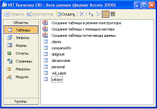 объекты как таблицы, формы, запросы, отчеты, модули, которые отображаются на