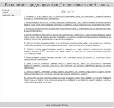 білетів для перевірки якості знань. За допомогою бази даних вимог щодо
