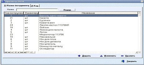 введення, перегляд, коригування даних (код інструмента, одиниця виміру, назва).