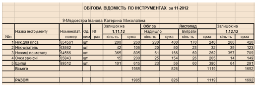картки обліку медичних інструментів, як за місяць, так і по результатам кожної