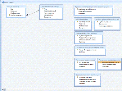структуре базе данных имеется 10 таблиц, а так же отображены связи между ними