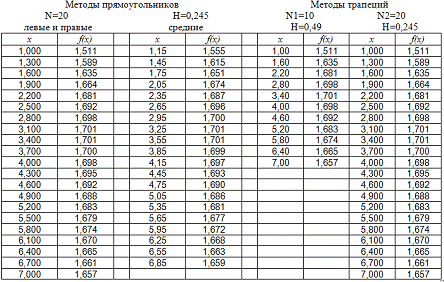 интеграл методом средних прямоугольников для 20 разбиений и методом трапеций