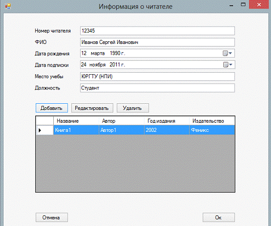 кнопку добавить, ввести информацию о читателе и нажать кнопку «Ок».