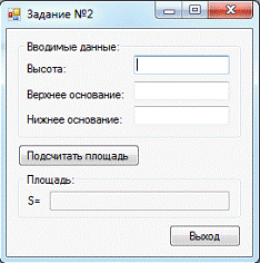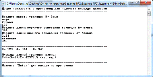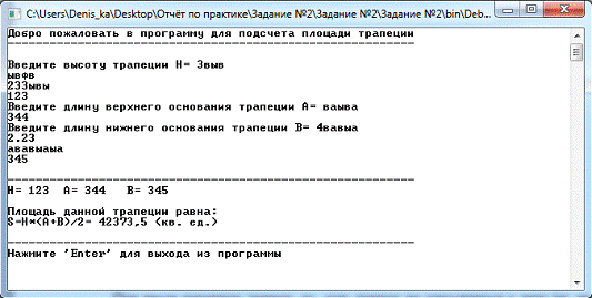 trap.h);.WriteLine("S=H*(A+B)/2= "+"{0,1:N5}",s+" (кв. ед.)");.WriteLine();.WriteLine("----------------------------------------------------------");.WriteLine("Нажмите 'Enter' для выхода из программы");