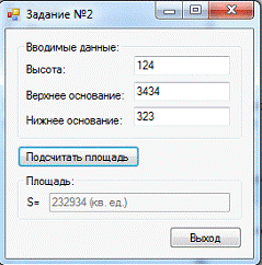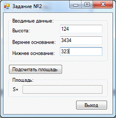 " + trap.b.ToString());.WriteLine();.WriteLine("Площадь данной трапеции равна:");s=trap.AreaTrapeze(trap.a, trap.b,