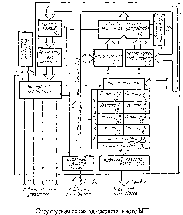 более подробная структурная схема однокристального МП. Здесь блок внутренних